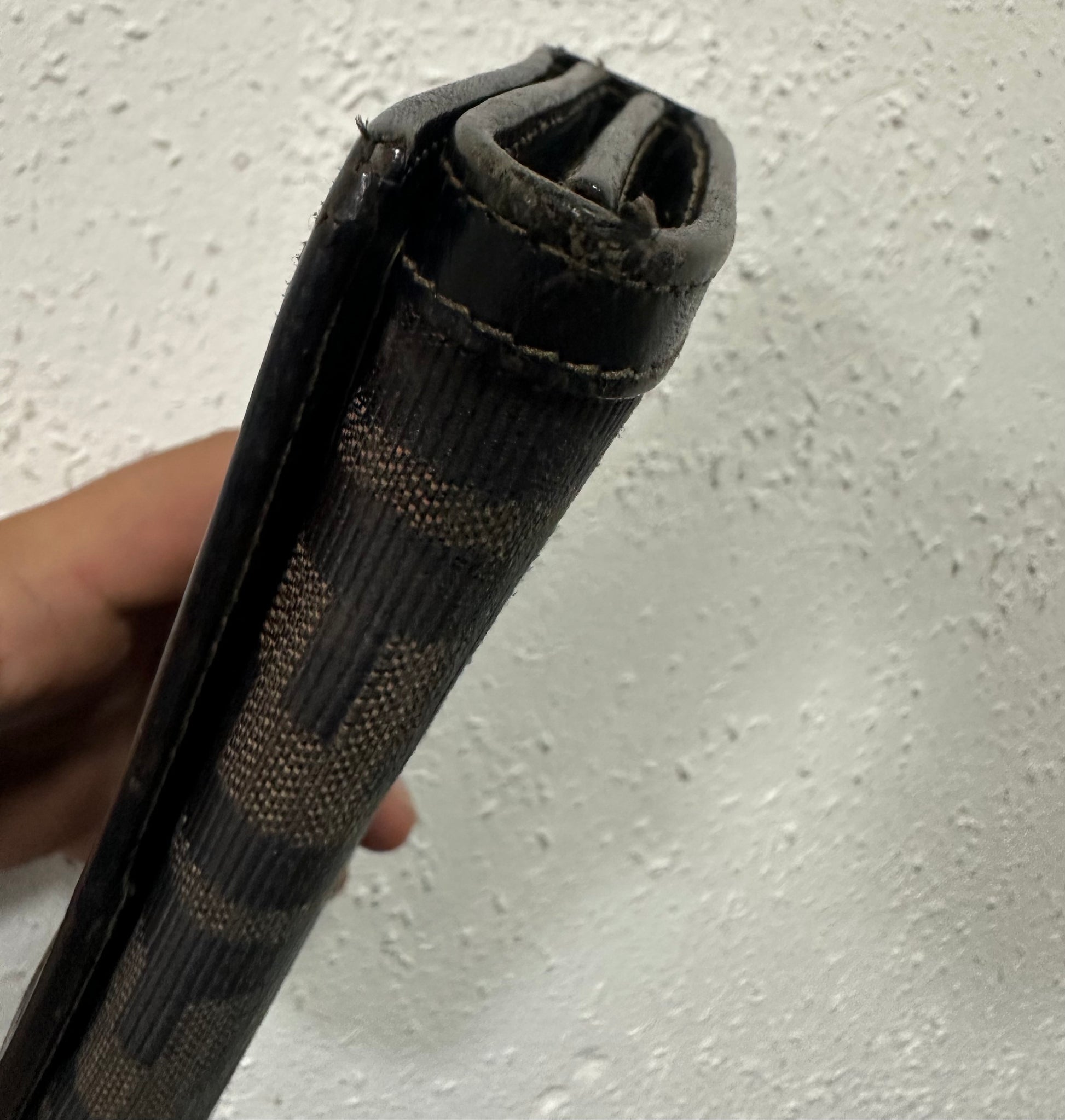 Die Fendi Geldbörse mit Monogramm in Braun ist der perfekte Begleiter für den stilbewussten Kunden. Die abgeriebenen Ecken verleihen der Geldbörse einen charmanten Vintage-Look, während das Monogramm in gutem Zustand erhalten bleibt. Das Innenfutter ist etwas schmutzig, jedoch bleibt der allgemeine Zustand der Geldbörse in Ordnung.