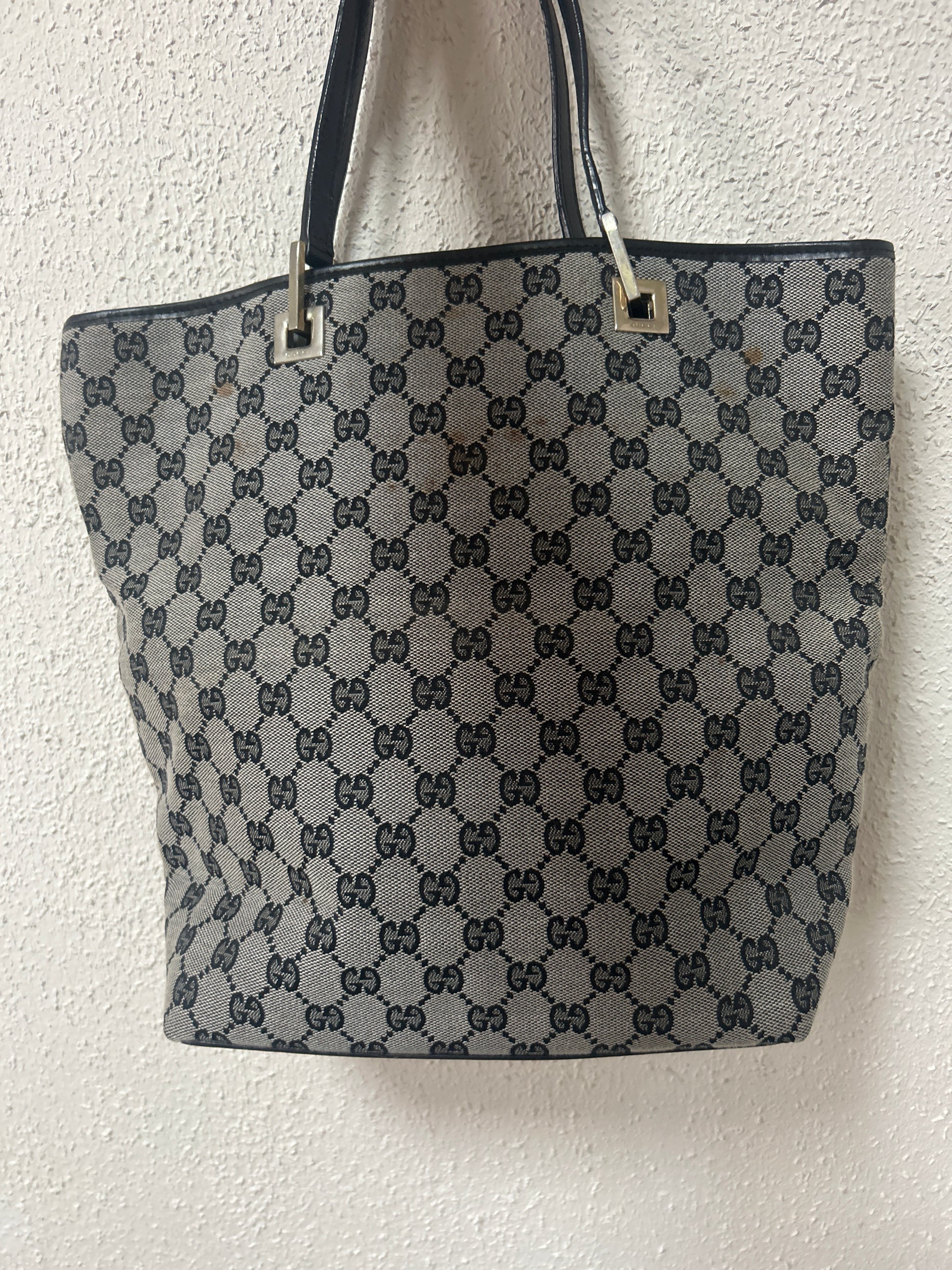 Diese GG Monogramm-Handtasche in Grau bietet Dir den klassischen Gucci-Stil mit dem bekannten Allover-Logo. Die Monogrammbeschichtung ist intakt, ohne Löcher oder Risse. Auf beiden Seiten befinden sich einige Flecken.