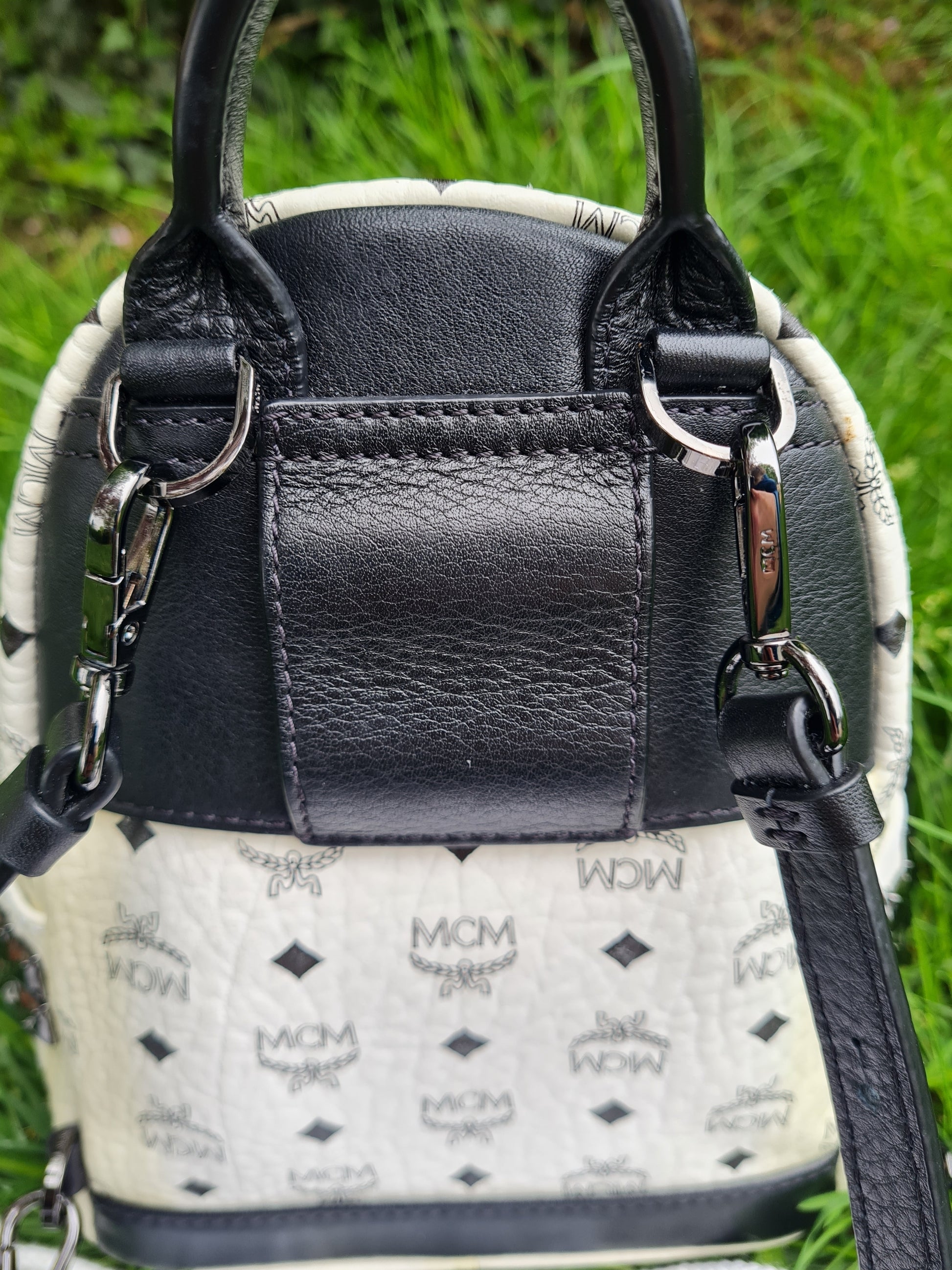 Der Rucksack von MCM weist einen leichten Gelbstich auf. Die Metallbeschläge haben ganz feine Kratzer und die einige Nieten an den Seiten sind leicht verkratzt. Von innen ist der Rucksack sehr gut erhalten.